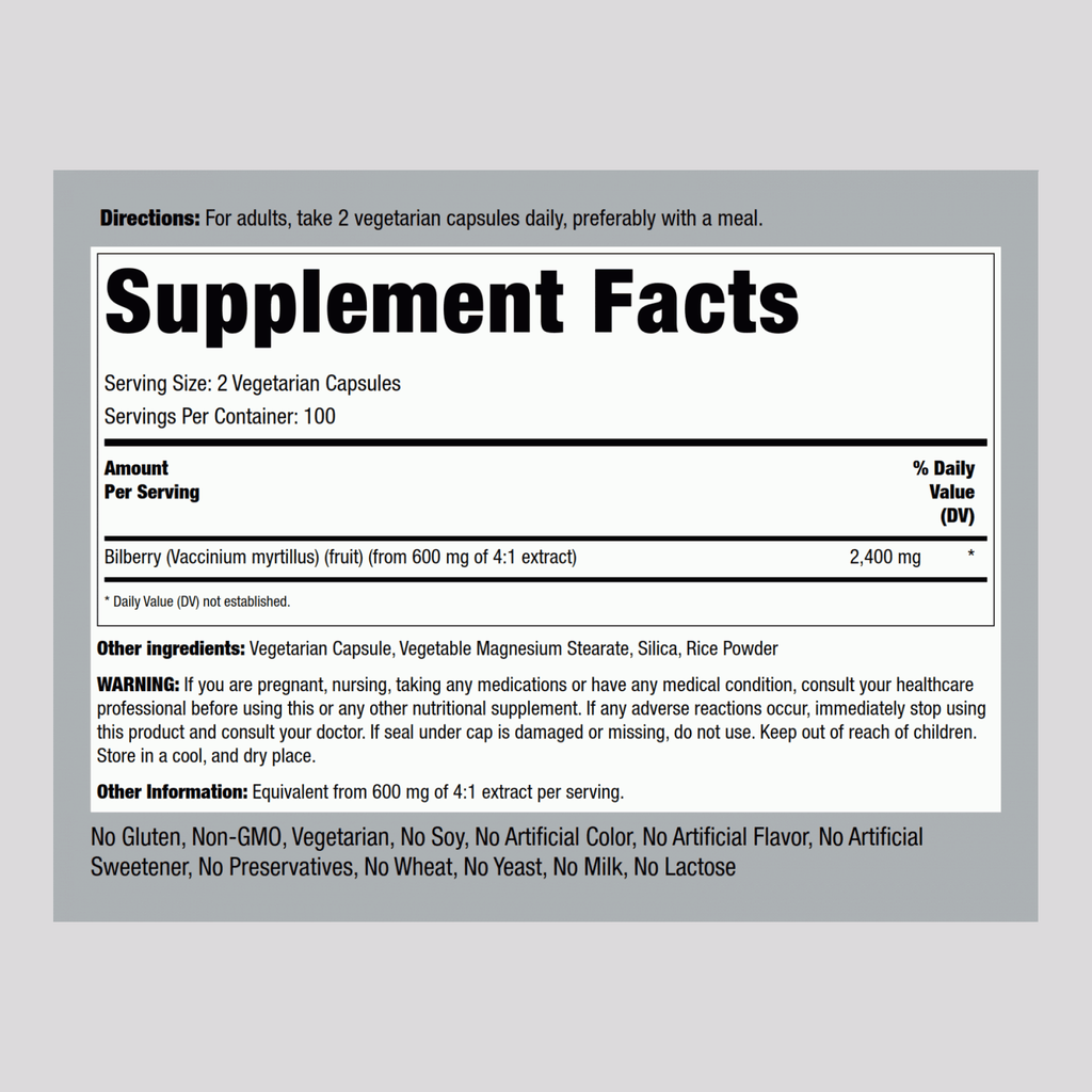 Bilberry Extract, 2400 mg (per serving), 200 Vegetarian Capsules