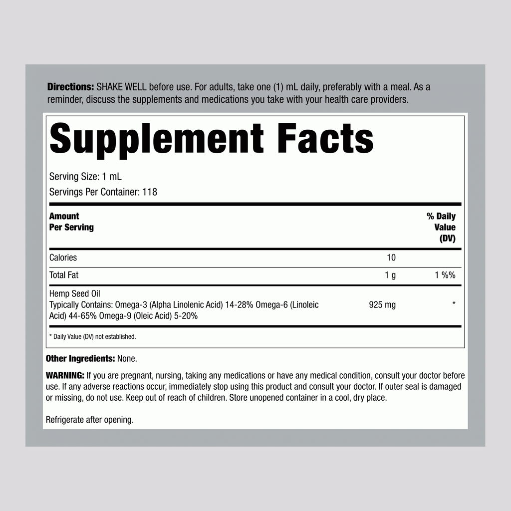 Hemp Seed Oil (Cold Pressed), 925 mg, 4 fl oz (118 mL) Dropper Bottle