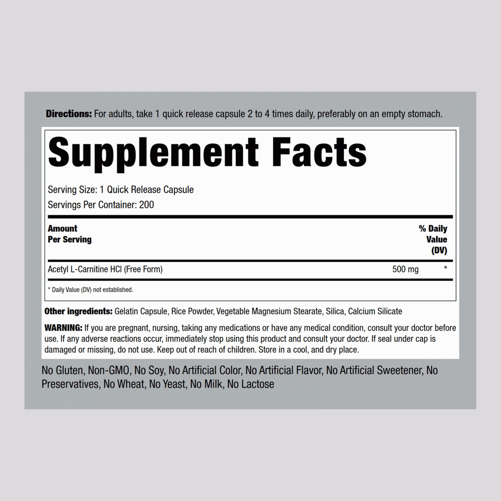 Acetyl L-Carnitine, 500 mg, 200 Quick Release Capsules
