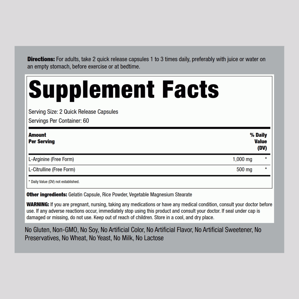 L-Arginine 1000 mg & Citrulline 500 mg, 1000/500 mg, 120 Quick Release Capsules